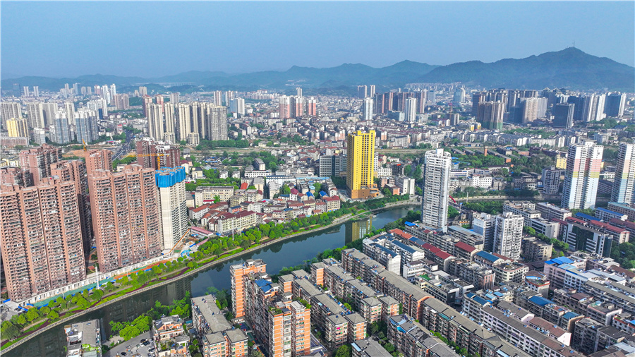 太平溪兩岸高樓錯落,綠樹夾道,城市和自然融合共生。(懷化日報全媒體記者 潘雨 攝)