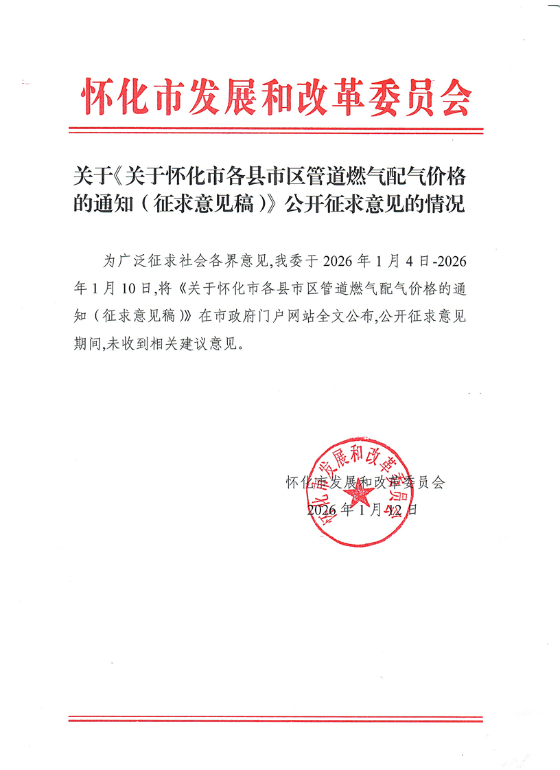 關(guān)于《關(guān)于懷化市各縣市區(qū)管道燃?xì)馀錃鈨r(jià)格的通知(征求意見(jiàn)稿)》公開(kāi)征求意見(jiàn)的情況
