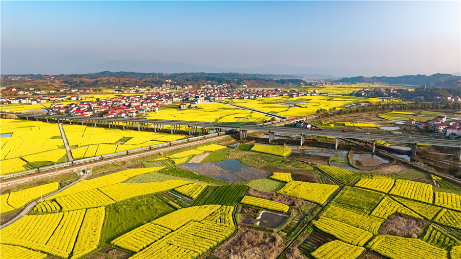 3月14日,溆浦縣 30 多萬畝油菜花競相綻放,普速鐵路、滬昆高速穿境而過,列車飛馳、車流穿梭,與金黃花海相映成畫,勾勒出一幅生態(tài)美、產(chǎn)業(yè)興、百姓富的春日盛景,成為溆浦大地最動人的春天名片。