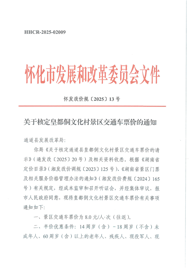 關(guān)于核定皇都侗文化村景區(qū)交通車票價的通知